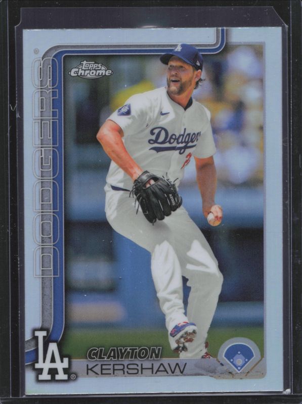 The Clayton Kershaw 2025 Topps Chrome #88 Refractor card is 1 of 65 Clayton Kershaw's card variations in the 2025 Topps Chrome set being tracked by Sports Card Investor, including Base, Geometric Refractor, Image Variation, Lightboard Logo Variation, and Negative Refractor.