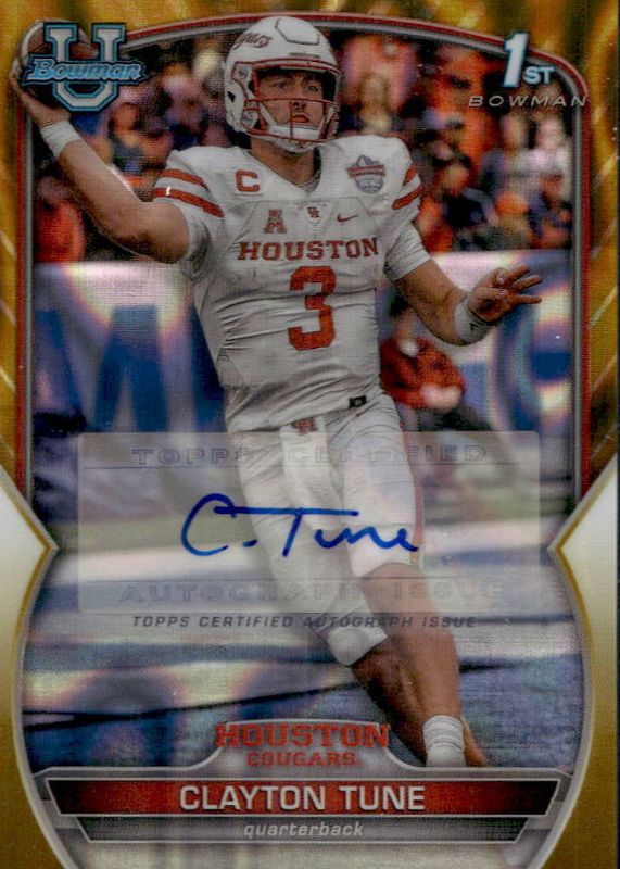 This card is 1 of 12 Clayton Tune's card variations in the 2022 Bowman Chrome University set being tracked by Sports Card Investor, including Prospect Auto (1st), Prospect Auto - Refractor /499 (1st), Prospect Auto - Lava Refractor /199 (1st), Prospect Auto - Green Refractor /99 (1st), and Prospect Auto - Yellow Refractor /75 (1st).