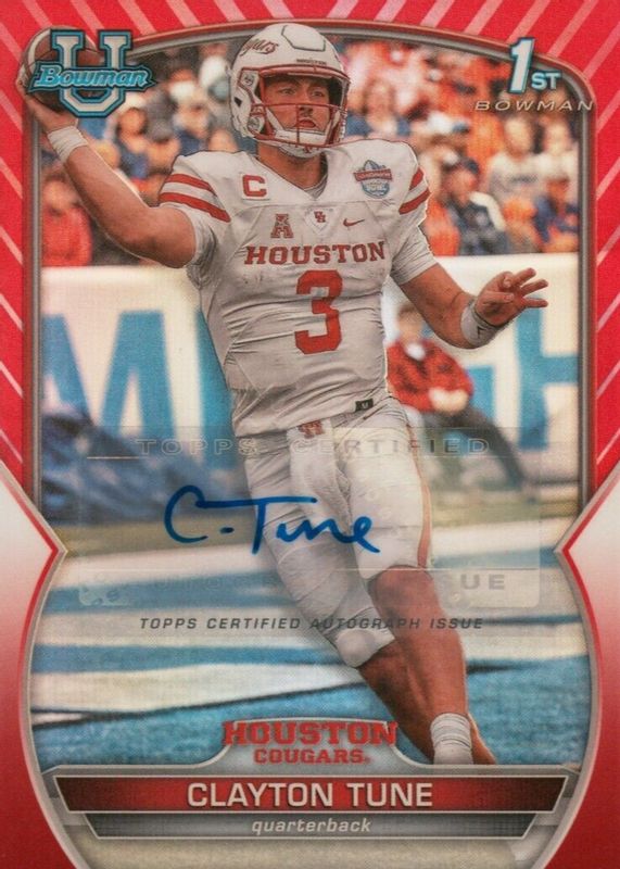This card is 1 of 12 Clayton Tune's card variations in the 2022 Bowman Chrome University set being tracked by Sports Card Investor, including Prospect Auto (1st), Prospect Auto - Refractor /499 (1st), Prospect Auto - Lava Refractor /199 (1st), Prospect Auto - Green Refractor /99 (1st), and Prospect Auto - Yellow Refractor /75 (1st).