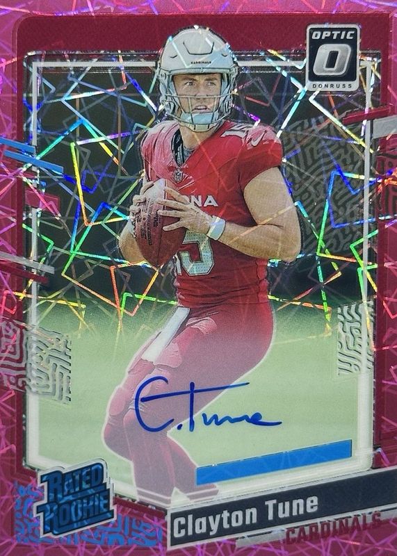 The Clayton Tune 2023 Optic #202 Rated Rookie Autographs - Pink Velocity /50 card in Raw condition has not changed in price in the last 30 days and was last sold for $3.26 .