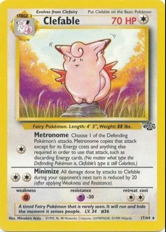 The Clefable 1999 Jungle #17/64 Unlimited card in Raw TCG (Near Mint) condition has moved down -$0.55 (-6.1%) in the last 30 days and was last sold for $8.49 .