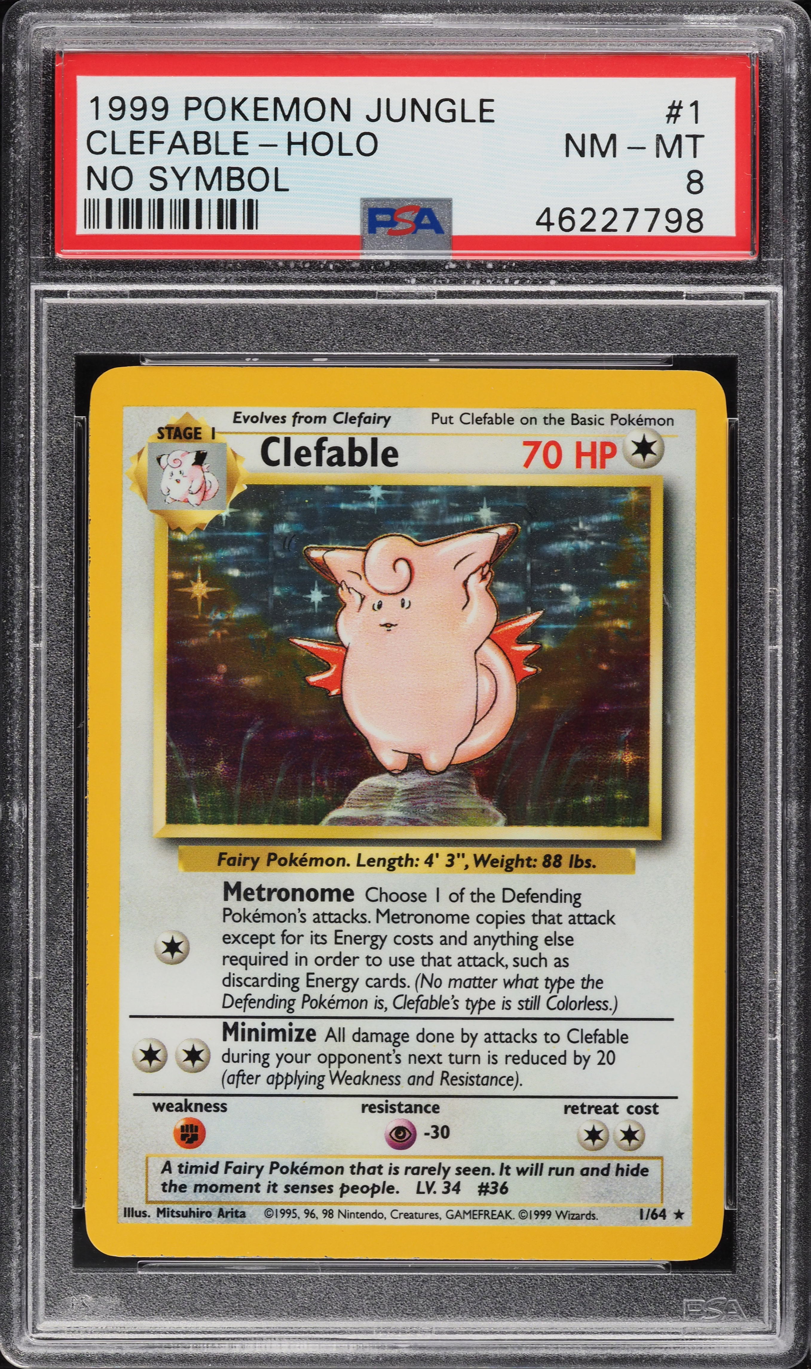 This card is 1 of 6 Clefable's card variations in the 1999 Jungle set being tracked by Sports Card Investor, including Unlimited, 1st Edition, 1st Edition Holo, Promo (Prerelease), and Unlimited Holo.