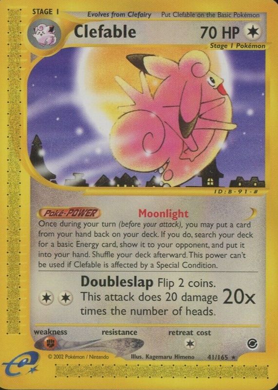 The Clefable 2002 Expedition #041/165 Base card in Raw TCG (Near Mint) condition has moved up $4.48 (+68.9%) in the last 30 days and was last sold for $10.98 .