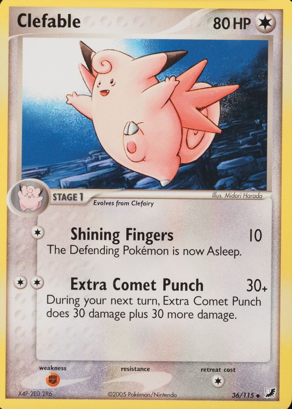 The Clefable 2005 EX: Unseen Forces #036/115 Base card in Raw TCG (Near Mint) condition has not changed in price in the last 30 days and was last sold for $2.99 .