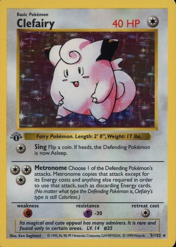 This card is 1 of 4 Clefairy's card variations in the 1999 Pokemon Game set being tracked by Sports Card Investor, including 1st Edition Holo, Shadowless Holo, and Unlimited Holo.