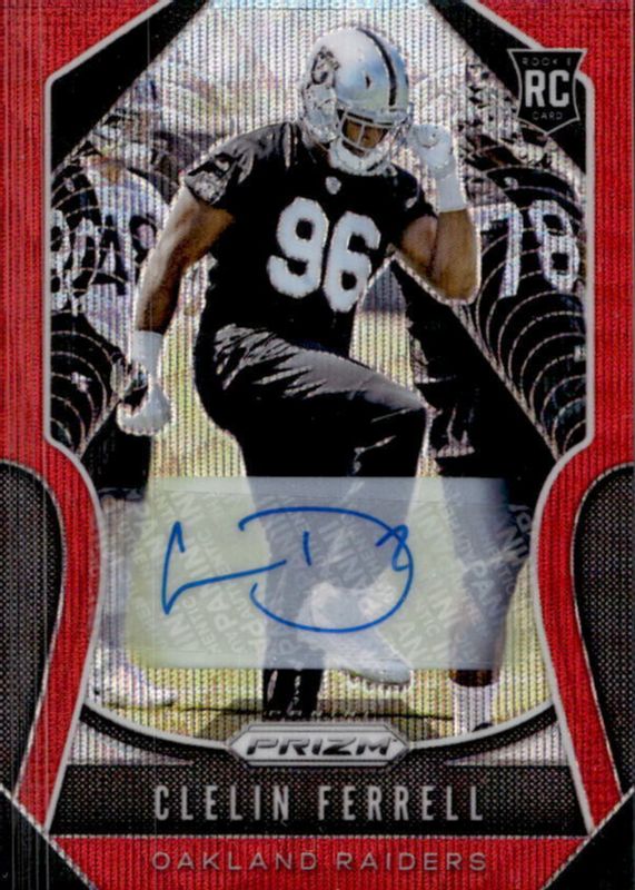 The Clelin Ferrell 2019 Prizm #316 Rookie Autographs - Red Wave /149 card in Raw condition has moved up $0.26 (+26.3%) in the last 30 days and was last sold for $1.25 .