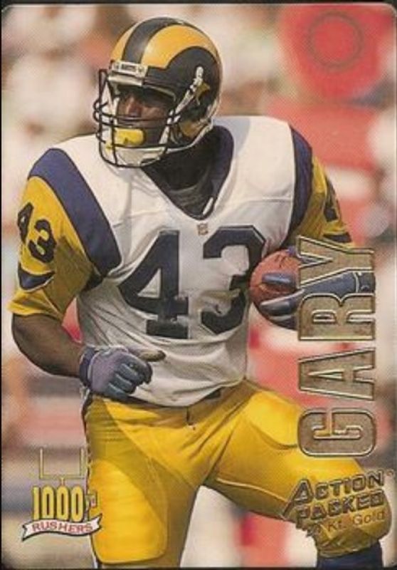 The Cleveland Gary 1993 Action Packed #34G 24K Gold card is 1 of 4 Cleveland Gary's card variations in the 1993 Action Packed set being tracked by Sports Card Investor, including Base, Mint /500, and 1000 Yd Rushers.