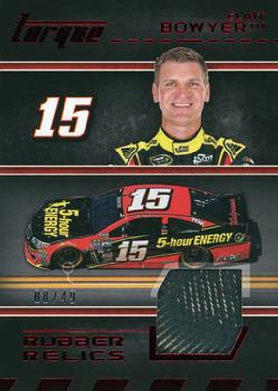 The Clint Bowyer 2016 Torque NASCAR #RR-CB Rubber Relics Red /49 card is 1 of 74 Clint Bowyer's card variations in the 2016 Torque NASCAR set being tracked by Sports Card Investor, including Base, Gold, Blue /125, Red /99, and Artist Proof /50.