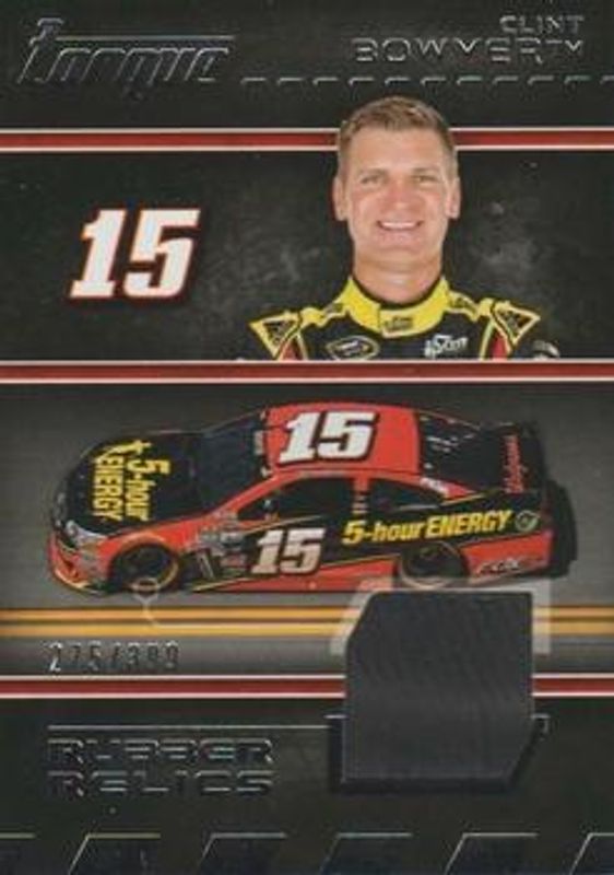 The Clint Bowyer 2016 Torque NASCAR #RR-CB Rubber Relics /399 card is 1 of 74 Clint Bowyer's card variations in the 2016 Torque NASCAR set being tracked by Sports Card Investor, including Base, Gold, Blue /125, Red /99, and Artist Proof /50.