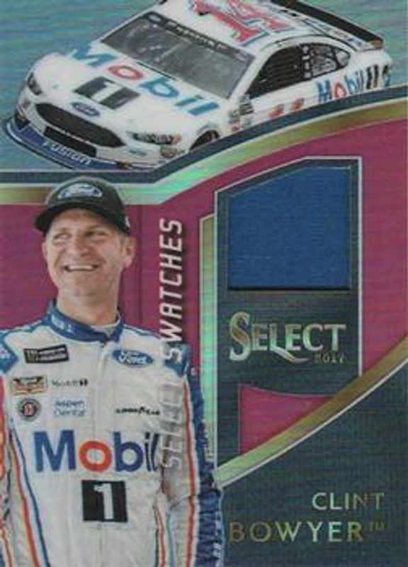 The Clint Bowyer 2017 Select NASCAR #BO Select Swatches Red /99 card is 1 of 60 Clint Bowyer's card variations in the 2017 Select NASCAR set being tracked by Sports Card Investor, including #121 Base, #61 Base, #61 Purple Pulsar, #61 Silver, and #61 Red White & Blue Pulsar /299.