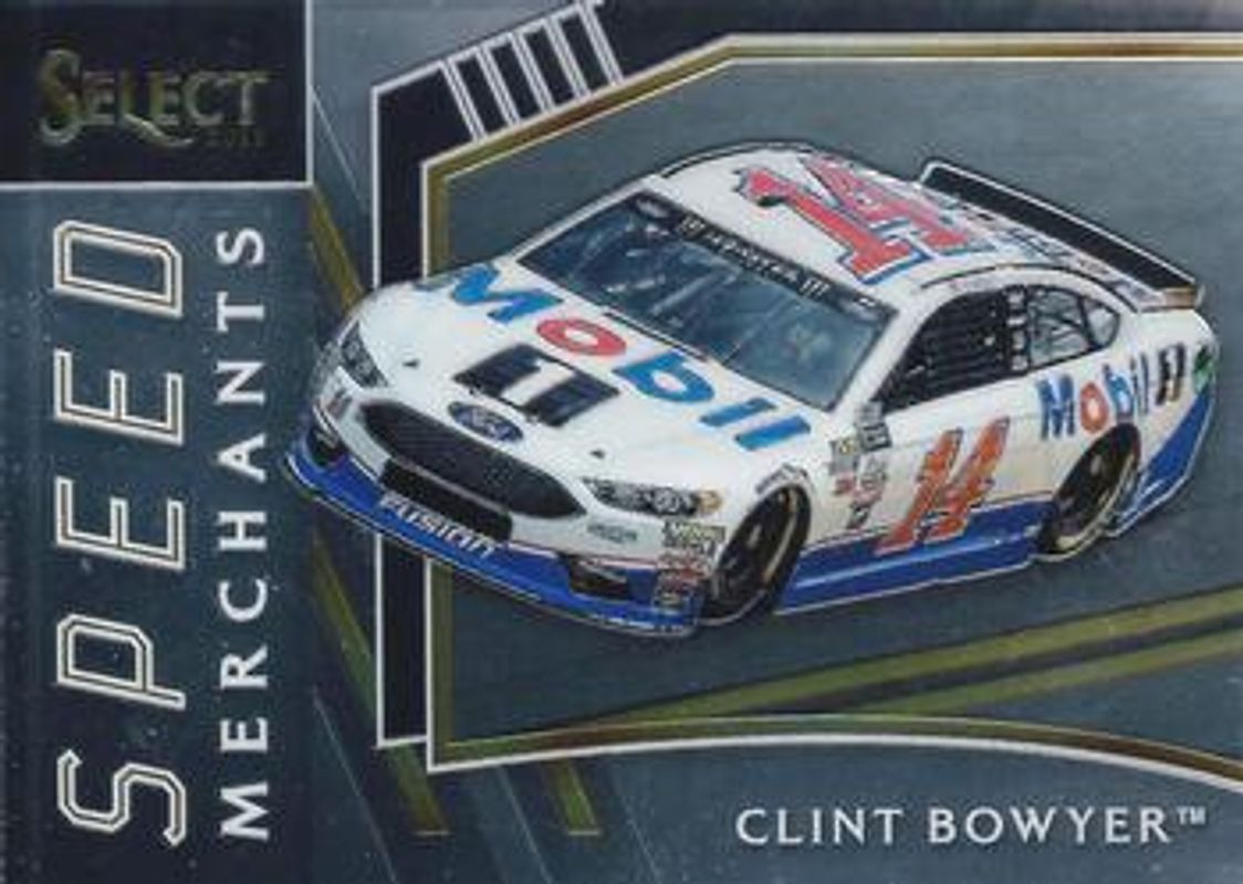 The Clint Bowyer 2017 Select NASCAR #S12 Speed Merchants card is 1 of 60 Clint Bowyer's card variations in the 2017 Select NASCAR set being tracked by Sports Card Investor, including #121 Base, #61 Base, #61 Purple Pulsar, #61 Silver, and #61 Red White & Blue Pulsar /299.