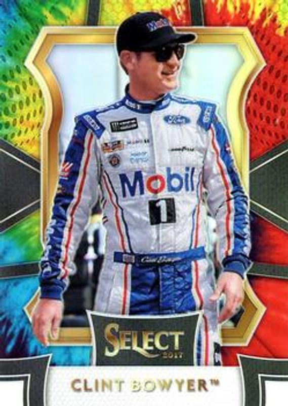 The Clint Bowyer 2017 Select NASCAR #61 Tie-Dye /24 card is 1 of 60 Clint Bowyer's card variations in the 2017 Select NASCAR set being tracked by Sports Card Investor, including #121 Base, #61 Base, #61 Purple Pulsar, #61 Silver, and #61 Red White & Blue Pulsar /299.