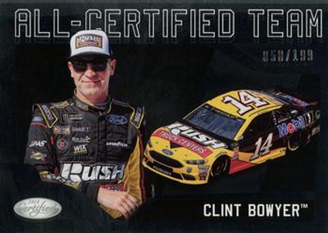 The Clint Bowyer 2018 Certified NASCAR #ACT17 All Certified Team /199 card is 1 of 75 Clint Bowyer's card variations in the 2018 Certified NASCAR set being tracked by Sports Card Investor, including Base /149, Orange /249, Mirror Gold /25, Red /25, and Blue /20.