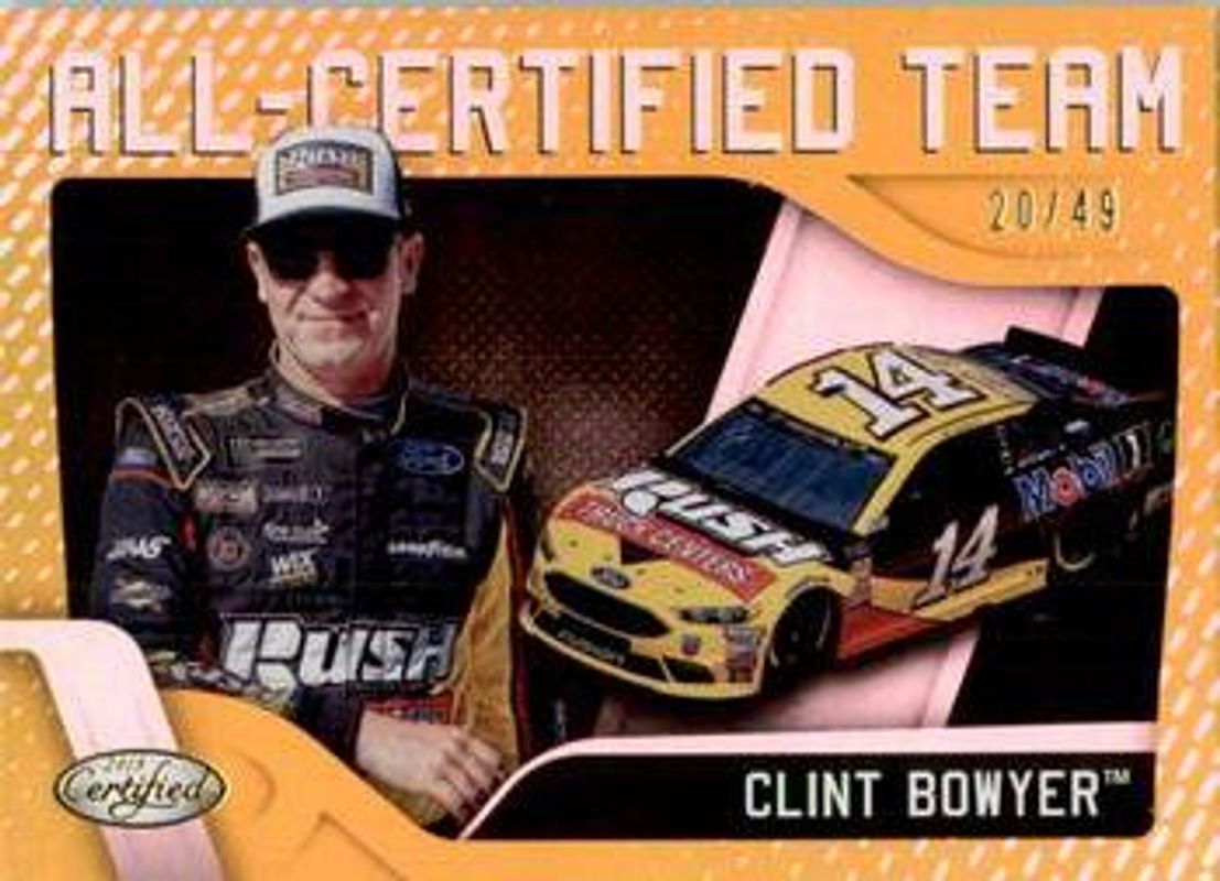 The Clint Bowyer 2018 Certified NASCAR #ACT17 All Certified Team - Gold /49 card is 1 of 75 Clint Bowyer's card variations in the 2018 Certified NASCAR set being tracked by Sports Card Investor, including Base /149, Orange /249, Mirror Gold /25, Red /25, and Blue /20.