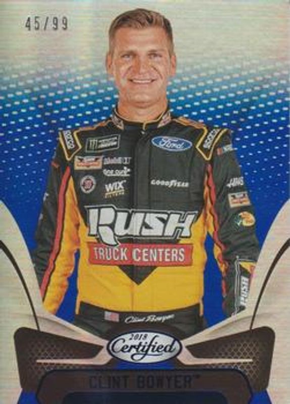 The Clint Bowyer 2018 Certified NASCAR #50 Blue /20 card is 1 of 75 Clint Bowyer's card variations in the 2018 Certified NASCAR set being tracked by Sports Card Investor, including Base /149, Orange /249, Mirror Gold /25, Red /25, and Gold /15.
