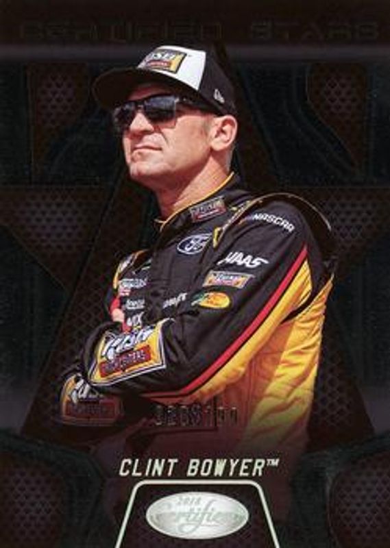 The Clint Bowyer 2018 Certified NASCAR #CS13 Certified Stars /199 card is 1 of 75 Clint Bowyer's card variations in the 2018 Certified NASCAR set being tracked by Sports Card Investor, including Base /149, Orange /249, Mirror Gold /25, Red /25, and Blue /20.