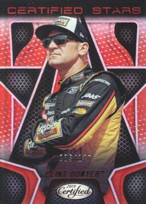 The Clint Bowyer 2018 Certified NASCAR #CS13 Certified Stars - Red /149 card is 1 of 75 Clint Bowyer's card variations in the 2018 Certified NASCAR set being tracked by Sports Card Investor, including Base /149, Orange /249, Mirror Gold /25, Red /25, and Blue /20.