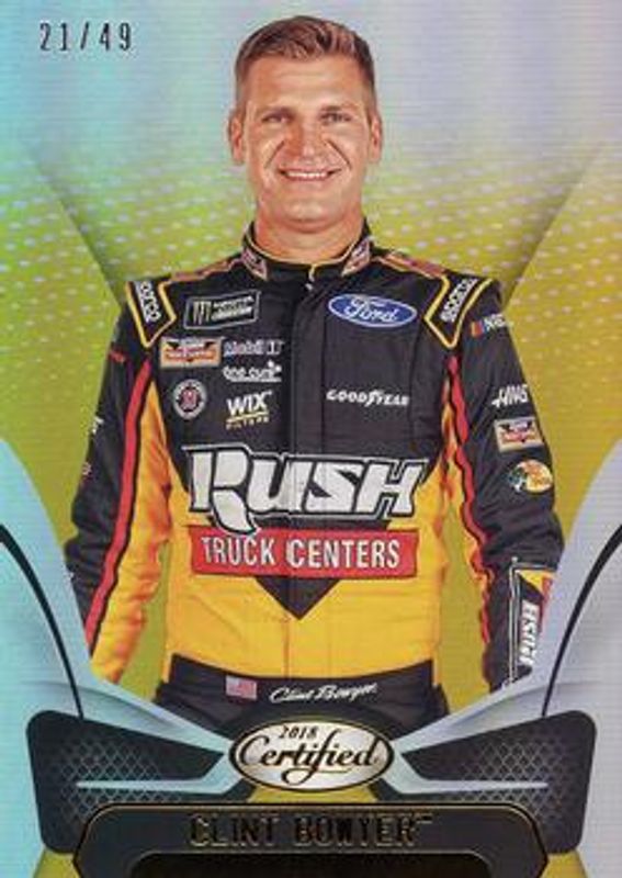 The Clint Bowyer 2018 Certified NASCAR #50 Gold /15 card is 1 of 75 Clint Bowyer's card variations in the 2018 Certified NASCAR set being tracked by Sports Card Investor, including Base /149, Orange /249, Mirror Gold /25, Red /25, and Blue /20.