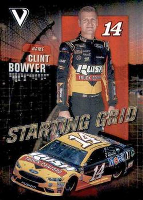 The Clint Bowyer 2018 Victory Lane NASCAR #S10 Starting Grid card is 1 of 60 Clint Bowyer's card variations in the 2018 Victory Lane NASCAR set being tracked by Sports Card Investor, including Base, Silver, Gold /99, Red /49, and Blue /25.
