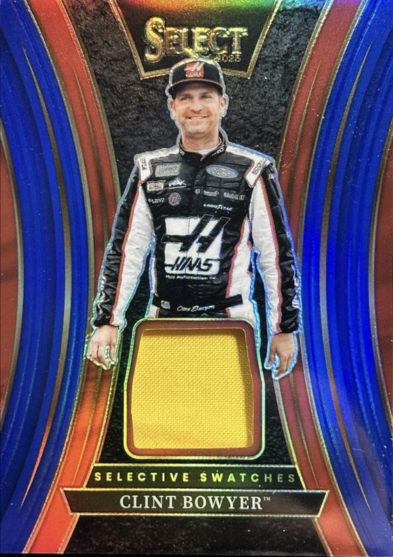 The Clint Bowyer 2025 Select NASCAR #SS-CBR Selective Swatches Blue /35 card is 1 of 69 Clint Bowyer's card variations in the 2025 Select NASCAR set being tracked by Sports Card Investor, including Base Pit Road, Base Pit Road Orange Flash, Base Pit Road Orange Ice, Base Pit Road Silver, and Base Pit Road Tri-Color.