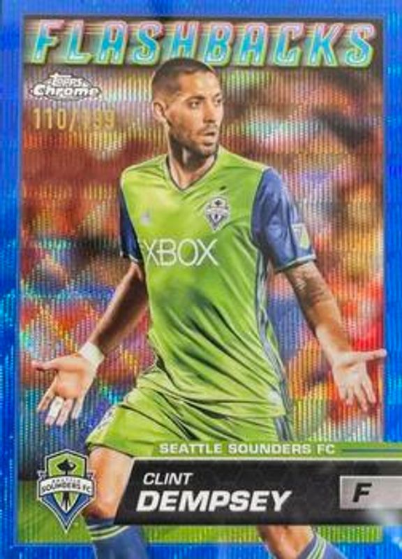 The Clint Dempsey 2023 Topps Chrome MLS #157 Blue Wave Refractor /199 card is 1 of 23 Clint Dempsey's card variations in the 2023 Topps Chrome MLS set being tracked by Sports Card Investor, including Base, Pink X-Fractor, Refractor, Speckle Refractor, and Blue Mini-Diamond Refractor /199.