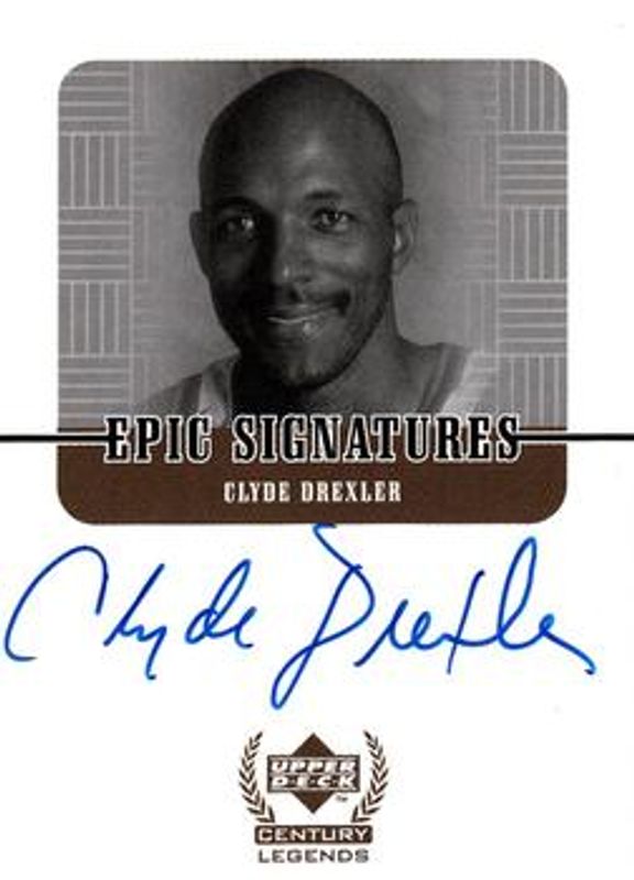 The Clyde Drexler 1998 Upper Deck Century Legends #CD Epic Signatures card is 1 of 3 Clyde Drexler's card variations in the 1998 Upper Deck Century Legends set being tracked by Sports Card Investor, including Epic Signatures Century /100, and Jerseys of the Century /6.