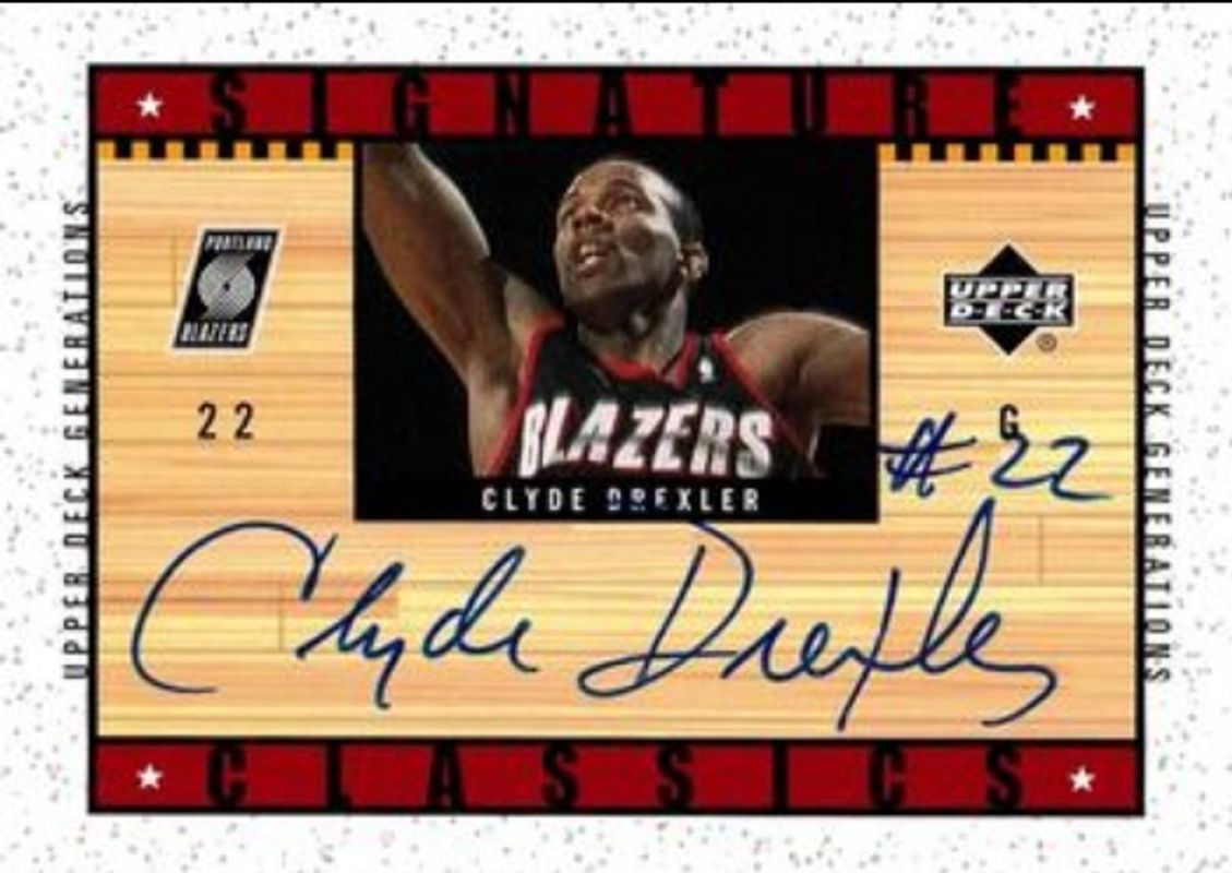 The Clyde Drexler 2002 Upper Deck Generations #CD-S Signatures Classics card is 1 of 2 Clyde Drexler's card variations in the 2002 Upper Deck Generations set being tracked by Sports Card Investor, including All Time Authentics.