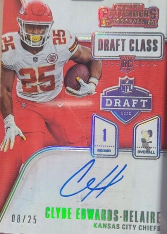 The Clyde Edwards-Helaire 2020 Contenders #DC-CEH Draft Class Autographs (/25) Rookie card in Raw condition has not changed in price in the last 30 days and was last sold for $11.50 .