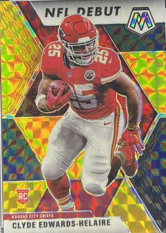 This card is 1 of 68 Clyde Edwards-Helaire's card variations in the 2020 Mosaic set being tracked by Sports Card Investor, including Base, NFL Debut, Choice Red & Green, Green, and NFL Debut - Choice Red & Green.