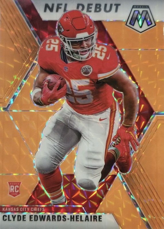 The Clyde Edwards-Helaire 2020 Mosaic #266 NFL Debut - Orange Fluorescent /25 Rookie card in Raw condition has not changed in price in the last 30 days and was last sold for $22.00 .