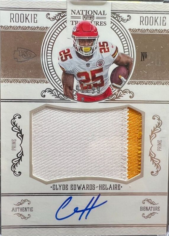 The Clyde Edwards-Helaire 2020 National Treasures #CRS-CH Crossover Rookie Patch Autographs /99 card in Raw condition has not changed in price in the last 30 days and was last sold for $8.76 .