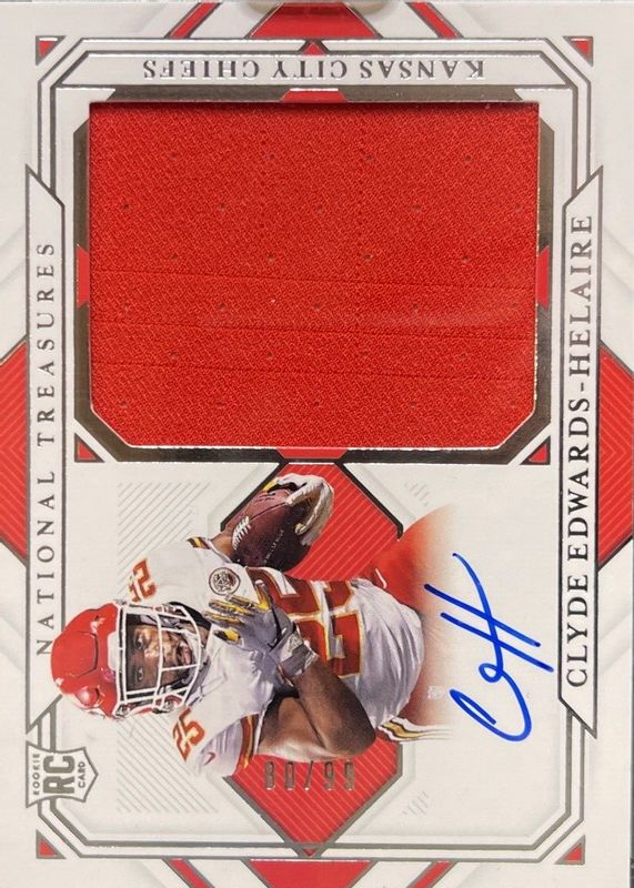 The Clyde Edwards-Helaire 2020 National Treasures #RMS-CEH Rookie Material Signatures /99 card in Raw condition has not changed in price in the last 30 days and was last sold for $6.50 .