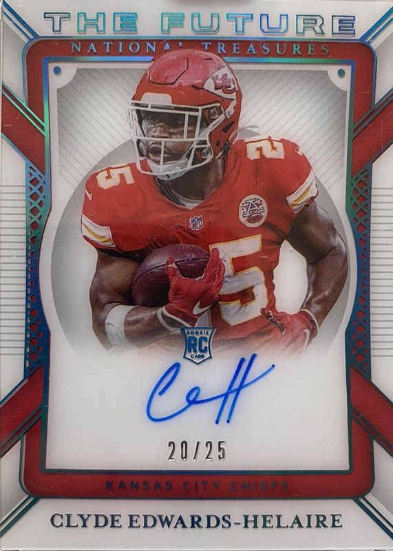 The Clyde Edwards-Helaire 2020 National Treasures #TF-CEH The Future Autographs /25 Rookie card in Raw condition has not changed in price in the last 30 days and was last sold for $50.00 .