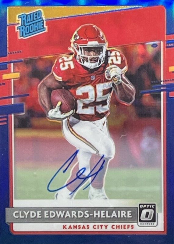 The Clyde Edwards-Helaire 2020 Optic #171 Rated Rookie Autographs - Blue /75 card in Raw condition has not changed in price in the last 30 days and was last sold for $11.99 .