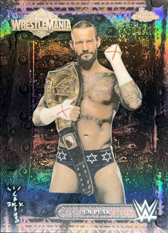 The CM Punk 2025 Topps Chrome WWE Cactus Jack x Wrestlemania #CCA-18 Cactus Champions - Black Ray Wave Refractor /10 card is 1 of 14 CM Punk's card variations in the 2025 Topps Chrome WWE Cactus Jack x Wrestlemania set being tracked by Sports Card Investor, including Base, Gold Ray Wave Refractor /50, Orange Ray Wave Refractor /25, Laser Ray Wave Refractor /20, and Black Ray Wave Refractor /10.