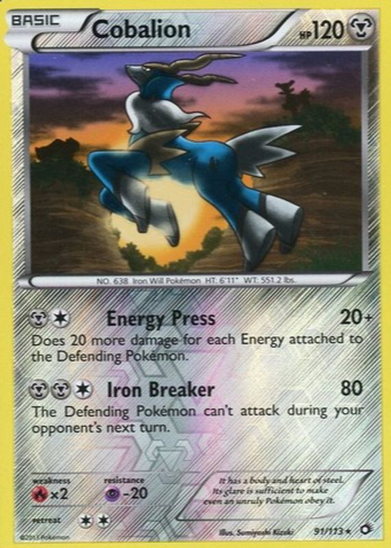 The Cobalion 2013 Black & White: Legendary Treasures #091/113 Reverse Holo card in Raw TCG (Lightly Played) condition has not changed in price in the last 30 days and was last sold for $6.59 .