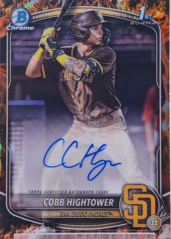 The Cobb Hightower 2025 Bowman #CPA-CHI Chrome Prospect Auto - FireFractor /3 (1st) card in Raw condition has not changed in price in the last 30 days and was last sold for $636.99 .