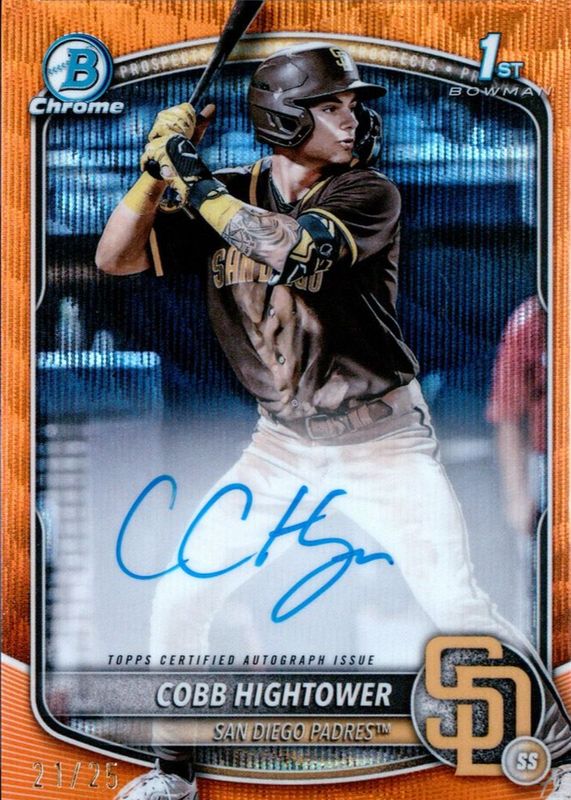 Best Prices Available For Sale of Cobb Hightower 2025 Bowman #CPA-CHI Chrome Prospect Auto - Orange Wave Refractor /25 (1st)