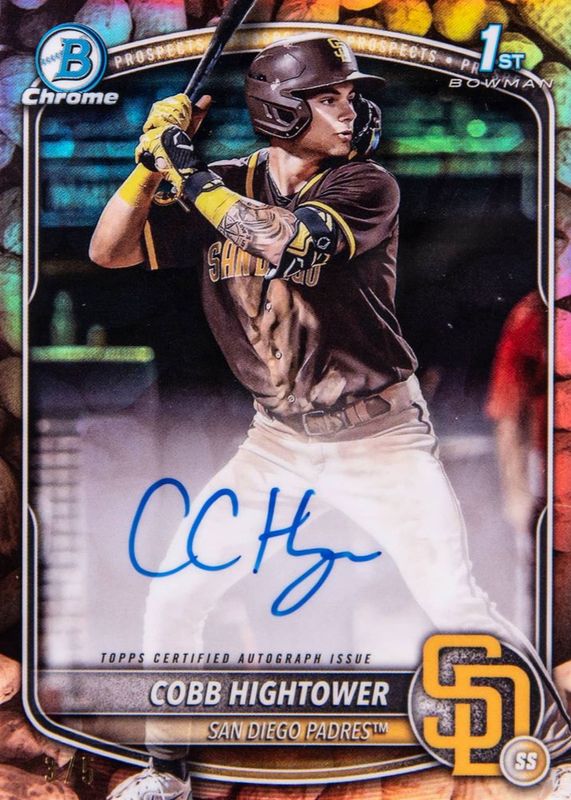 This card is 1 of 88 Cobb Hightower's card variations in the 2025 Bowman set being tracked by Sports Card Investor, including Chrome Prospects (1st), Chrome Prospects - Gumball Refractor (1st), Chrome Prospects - Mini Diamond Refractor (1st), Chrome Prospects - Peanuts Refractor (1st), and Chrome Prospects - Pearl Refractor (1st).