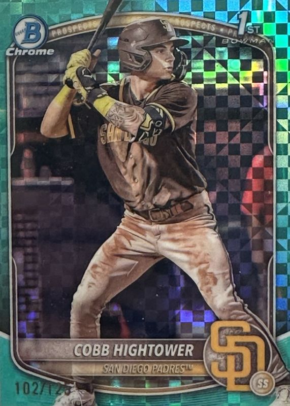 This card is 1 of 88 Cobb Hightower's card variations in the 2025 Bowman set being tracked by Sports Card Investor, including Chrome Prospects (1st), Chrome Prospects - Gumball Refractor (1st), Chrome Prospects - Mini Diamond Refractor (1st), Chrome Prospects - Peanuts Refractor (1st), and Chrome Prospects - Pearl Refractor (1st).