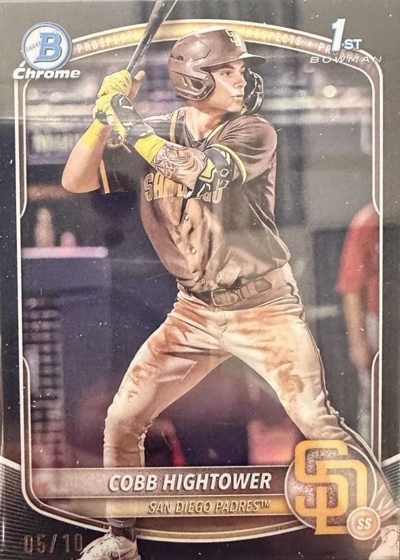 This card is 1 of 88 Cobb Hightower's card variations in the 2025 Bowman set being tracked by Sports Card Investor, including Chrome Prospects (1st), Chrome Prospects - Gumball Refractor (1st), Chrome Prospects - Mini Diamond Refractor (1st), Chrome Prospects - Peanuts Refractor (1st), and Chrome Prospects - Pearl Refractor (1st).