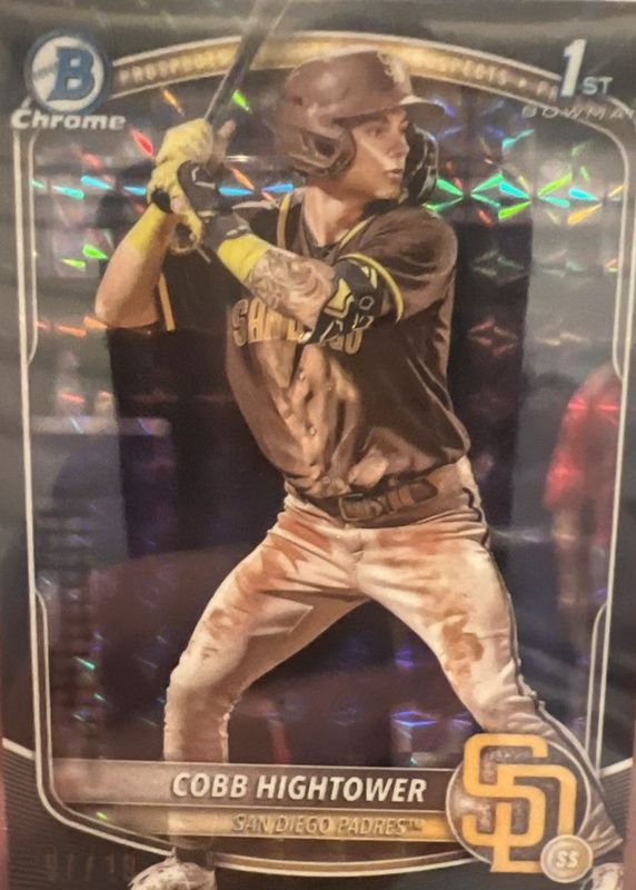This card is 1 of 88 Cobb Hightower's card variations in the 2025 Bowman set being tracked by Sports Card Investor, including Chrome Prospects (1st), Chrome Prospects - Gumball Refractor (1st), Chrome Prospects - Mini Diamond Refractor (1st), Chrome Prospects - Peanuts Refractor (1st), and Chrome Prospects - Pearl Refractor (1st).