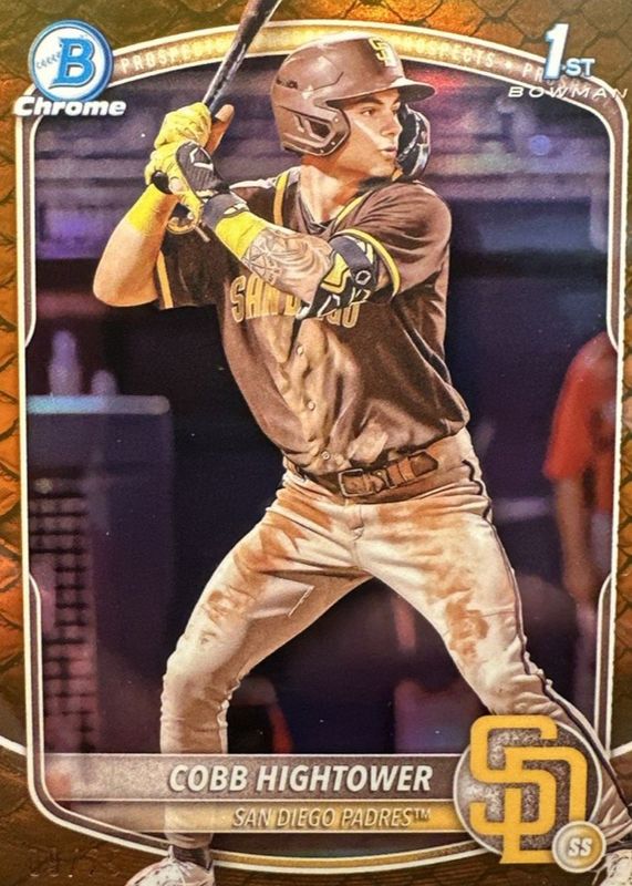 Recent Sales of Cobb Hightower 2025 Bowman #BCP-104 Chrome Prospects - Reptilian Orange Refractor /25 (1st) Raw