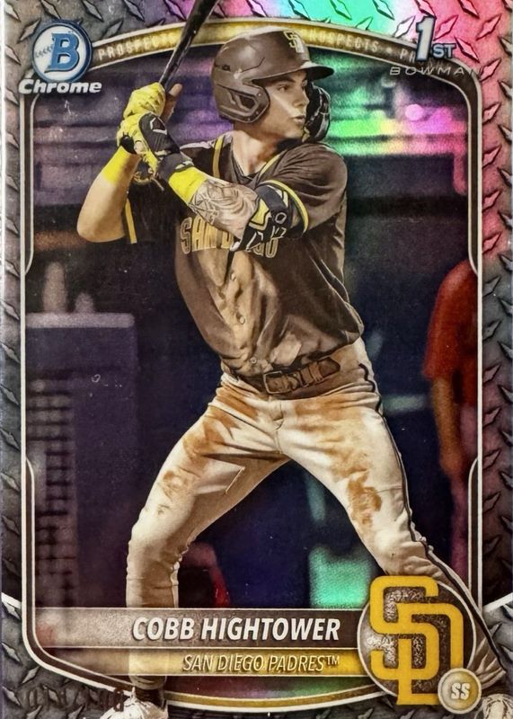 This card is 1 of 88 Cobb Hightower's card variations in the 2025 Bowman set being tracked by Sports Card Investor, including Chrome Prospects (1st), Chrome Prospects - Gumball Refractor (1st), Chrome Prospects - Mini Diamond Refractor (1st), Chrome Prospects - Peanuts Refractor (1st), and Chrome Prospects - Pearl Refractor (1st).