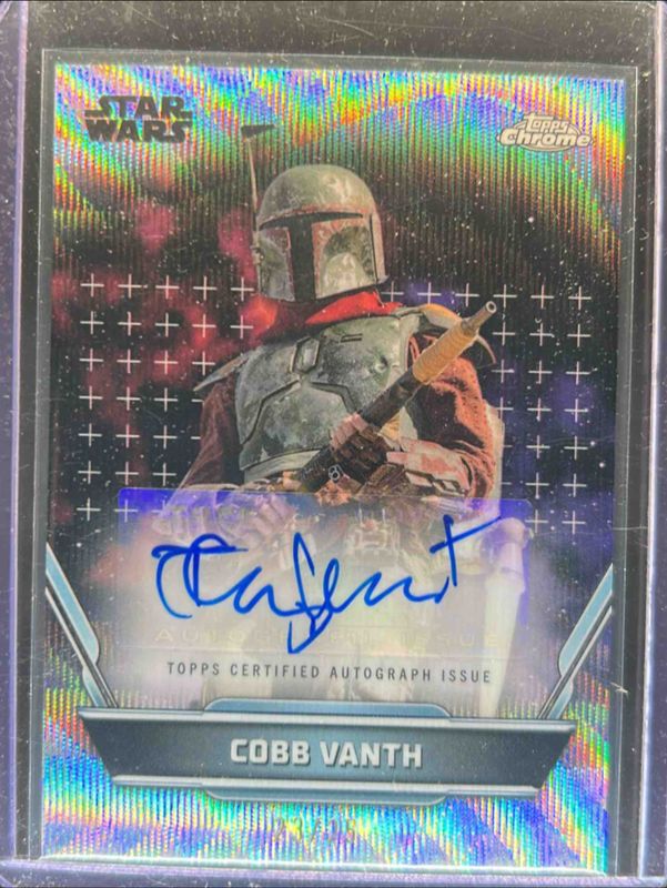 The Cobb Vanth 2024 Topps Star Wars Hyperspace #A-TO Autographs - Hyperlanes Refractor /25 card is 1 of 7 Cobb Vanth's card variations in the 2024 Topps Star Wars Hyperspace set being tracked by Sports Card Investor, including Nebulae Refractor, Autographs, Autographs - Pulsar Refractor /99, Autographs - Gold Galactic Dust Refractor /50, and Autographs - Red Hyperlanes Refractor /5.