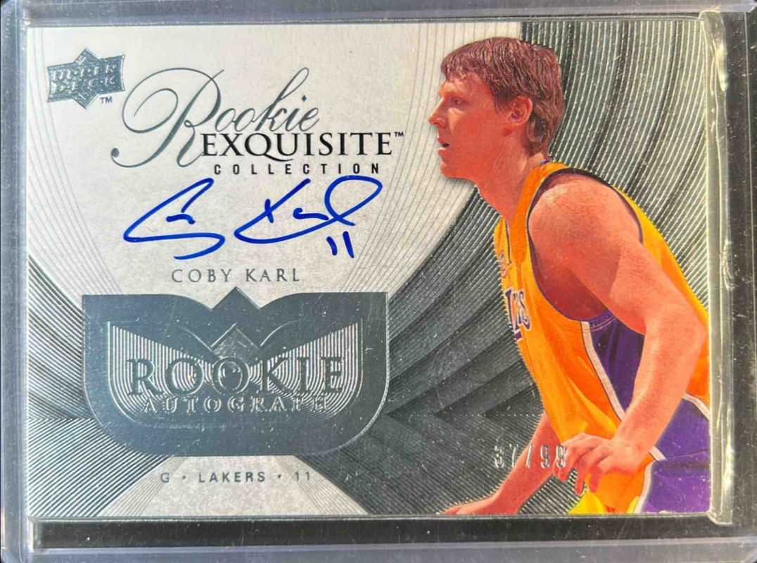 The Coby Karl 2007 Upper Deck Exquisite Collection #104 Base /99 Rookie card is 1 of 9 Coby Karl's card variations in the 2007 Upper Deck Exquisite Collection set being tracked by Sports Card Investor, including Gold /25, Black /1, Press Plates Black /1, Press Plates Cyan /1, and Press Plates Magenta /1.