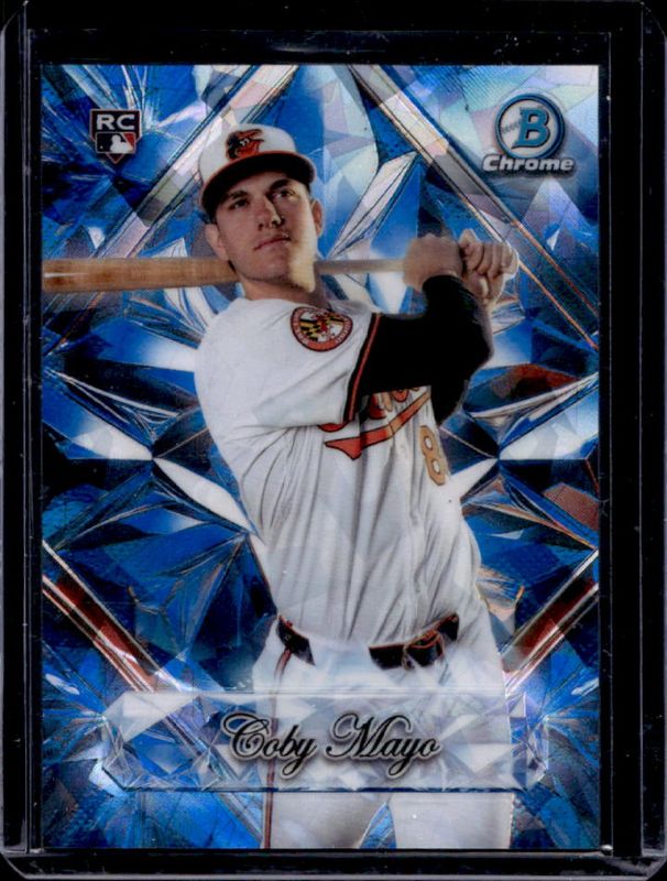 The Coby Mayo 2025 Bowman Sapphire Edition #BSS-11 Sapphire Selections Rookie card is 1 of 5 Coby Mayo's card variations in the 2025 Bowman Sapphire Edition set being tracked by Sports Card Investor, including Sapphire Selections - Gold Refractor /50, Sapphire Selections - Orange Refractor /25, Sapphire Selections - Red Refractor /5, and Sapphire Selections - Padparadscha Refractor /1.