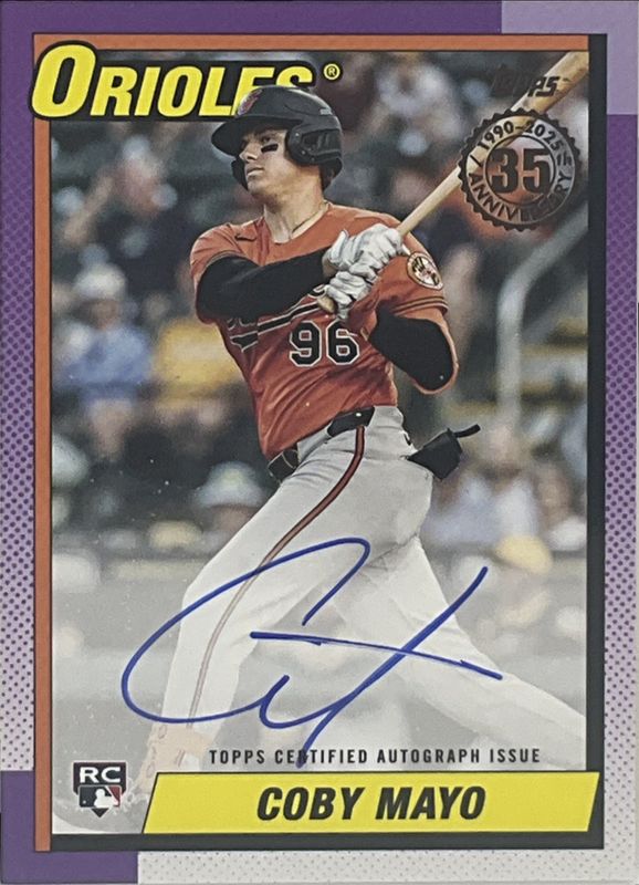 The Coby Mayo 2025 Topps #90A-CMA 1990 Baseball Autographs (Series 1) Rookie card is 1 of 234 Coby Mayo's card variations in the 2025 Topps set being tracked by Sports Card Investor, including Base, Aqua Holo Foil, Aqua Rainbow, Diamante Foil, and Eggs.