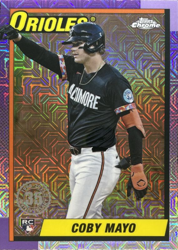 The Coby Mayo 2025 Topps #T90C-21 1990 Baseball Chrome Silver Pack Rookie card is 1 of 234 Coby Mayo's card variations in the 2025 Topps set being tracked by Sports Card Investor, including Base, Aqua Holo Foil, Aqua Rainbow, Diamante Foil, and Eggs.