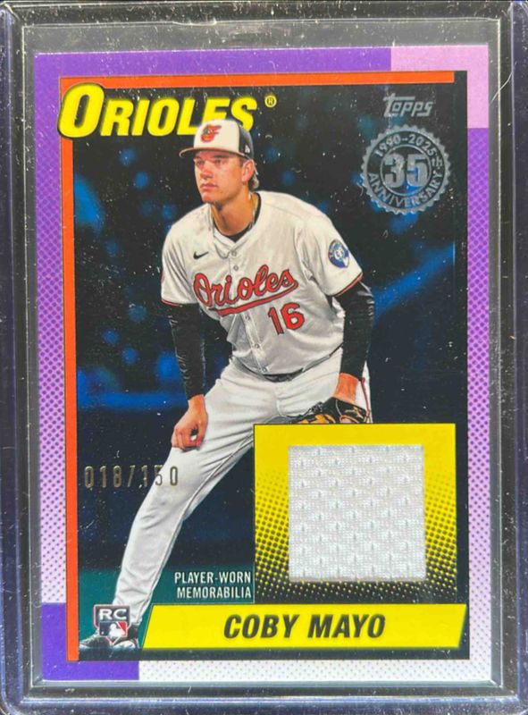 The Coby Mayo 2025 Topps #90R2-CM 1990 Baseball Relics (Series Two) - Blue /150 Rookie card is 1 of 234 Coby Mayo's card variations in the 2025 Topps set being tracked by Sports Card Investor, including Base, Aqua Holo Foil, Aqua Rainbow, Diamante Foil, and Eggs.